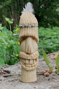 Skåret i kirsebær med øjne af balsatræ og pupiller af en kvist fra bøg. Figuren har desuden ligget i blød i bio-olie blandt med