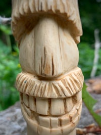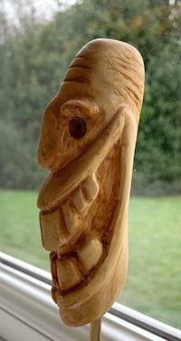 Skåret i kirsebær med øjne af balsatræ og pupiller af en kvist fra bøg. Figuren har desuden ligget i blød i bio-olie blandt med
