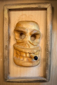 Skåret i kirsebær med øjne af balsatræ og pupiller af en kvist fra bøg. Figuren har desuden ligget i blød i bio-olie blandt med